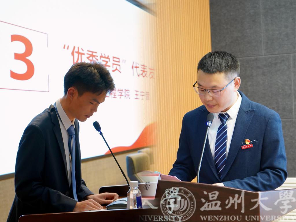 发言完毕,由yl23455永利官网党委书记、分党校校长李方强宣读结业学员名单、优秀学员名单、最佳理论学习奖、最美笔记获得者名单。经为期一周的专题讲座、实践教学、小组讨论、理论考试四个环节,来自温州大学南校区9个学院的374名学员成绩合格,全部予以毕业。同时,按照机考成绩*60%+笔记成绩*30%+考勤*10%的原则,结合班级工作和整体表现,共评出80名“优秀学员”;按照机考成绩排名,前10位学员为“最佳理论学习奖”;针对学员手册笔记整体情况,进行打分,按照内容齐全、字迹工整、态度端正、丰富多彩等原则共评出10本最美笔记。