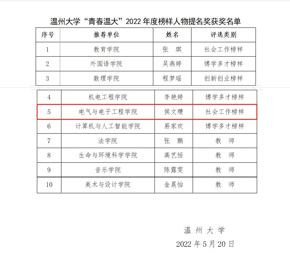 近期,温州大学“青春温大”2022年度榜样人物提名奖获奖名单公布,我院19级侯文瓒同学荣获温州大学“青春温大”2022年度榜样人物提名奖。