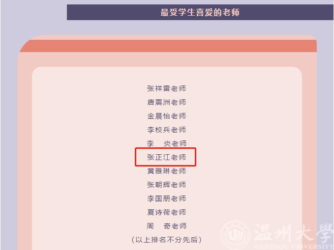 近期,温州大学“最受学生喜爱的老师”获奖名单公布,我院张正江老师荣获温州大学“最受学生喜爱的老师”荣誉称号。