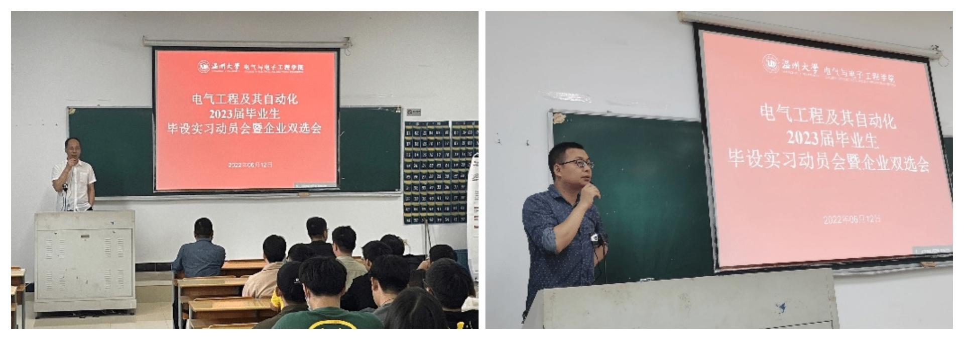 毕业设计和专业实习是本科教学计划中非常重要的实践性教学环节,是结合生产实践,锻炼实践能力和创新能力的重要途径,是学生从学校到社会、从理论到实践的转变。为做好2023届毕业设计和专业实习工作,6月12日上午,电气工程系在1B402举办了2023届毕业生毕设实习动员会暨企业双选会。参加本次会议的有电气系主任吴平、专业实习负责人闫正兵、19电气工程全体同学以及部分受邀企业。