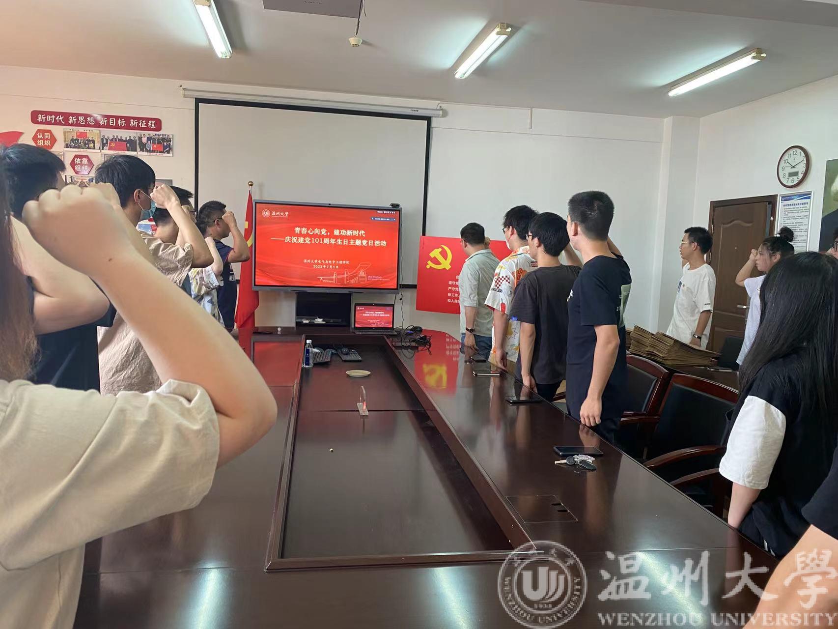 7月1日上午10:00,yl23455永利官网学生党支部全体支委和2022年上半年新发展党员在党建活动办公室1A512举行“青春心向党,建功新时代”暨温州大学电气电子学院庆祝建党101周年生日主题党日活动。全体支部党员学习观看了《“国史讲堂”系列理论视频之“党史微课”系列》——中国共产党为何能让旧中国面貌焕然一新、为什么说中国共产党在抗战中发挥了中流砥柱作用两堂微课,重温了历史,坚定了入党初心,也进一步加强了与会党员的党性修养。