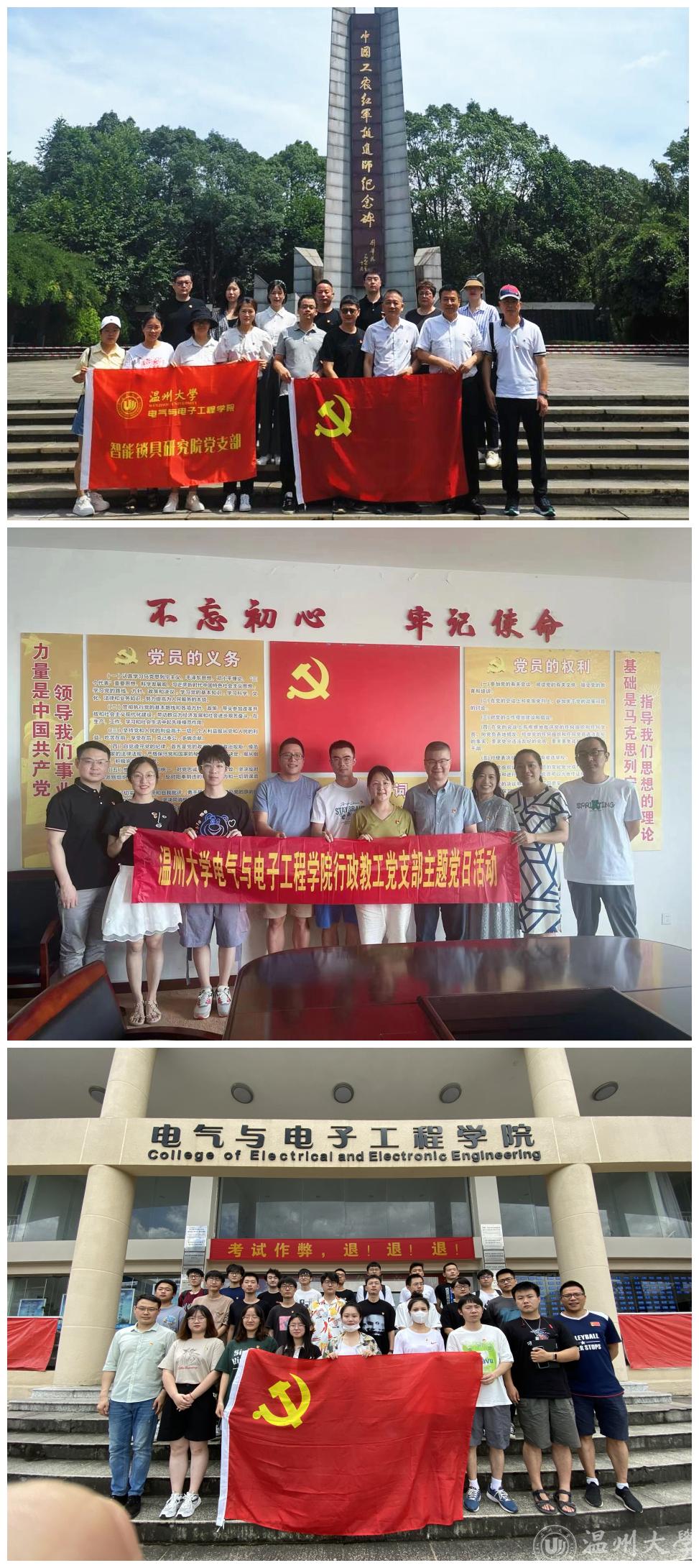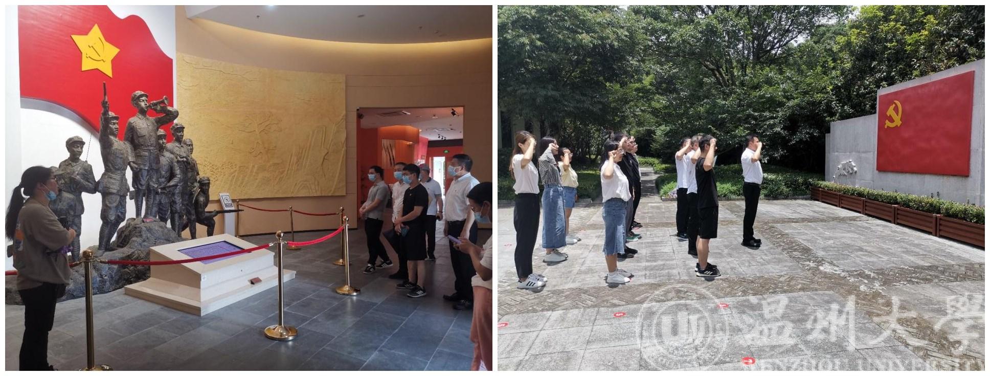 6月28日,温州大学智能锁具研究院党支部联合温州市五金商会、瓯海区智能安防产业协会,以“商会永远跟党走,同心奋进新征程”为主题开展迎“七一”主题党日活动。上午10时许,党员同志们到达工农红军挺进师纪念园,看到了那象征着烈士鲜血染红的红旗长廊,上面雕刻着迟浩田题写的几个醒目大字"中国工农红军挺进师纪念园"。在导游的指引与解说下,我们一边重走“北上抗日出征门”,参观中国工农红军挺进师纪念碑,一边倾听他们的革命故事,缅怀革命先辈。
