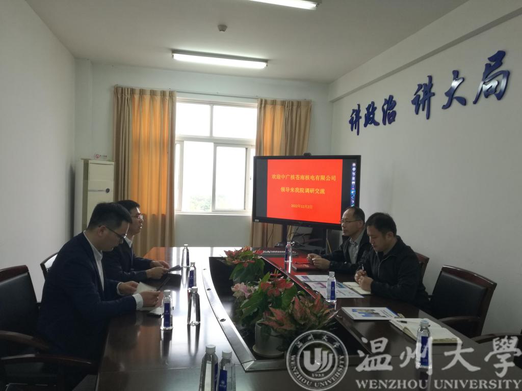2022年11月2日上午10:10,中国500强、知名央企——中广核苍南核电有限公司技术部副经理刘二林、信息文档经理孙方兴与核燃料主管工程师刘洋在1A512会议室与我院党委副书记曾蓓蕾、学工办主任廖晓安、就业辅导员屠昌浩以及研究生辅导员余明新就关于2023届毕业生招聘以及建立长期就业实践基地进行了充分的交流。