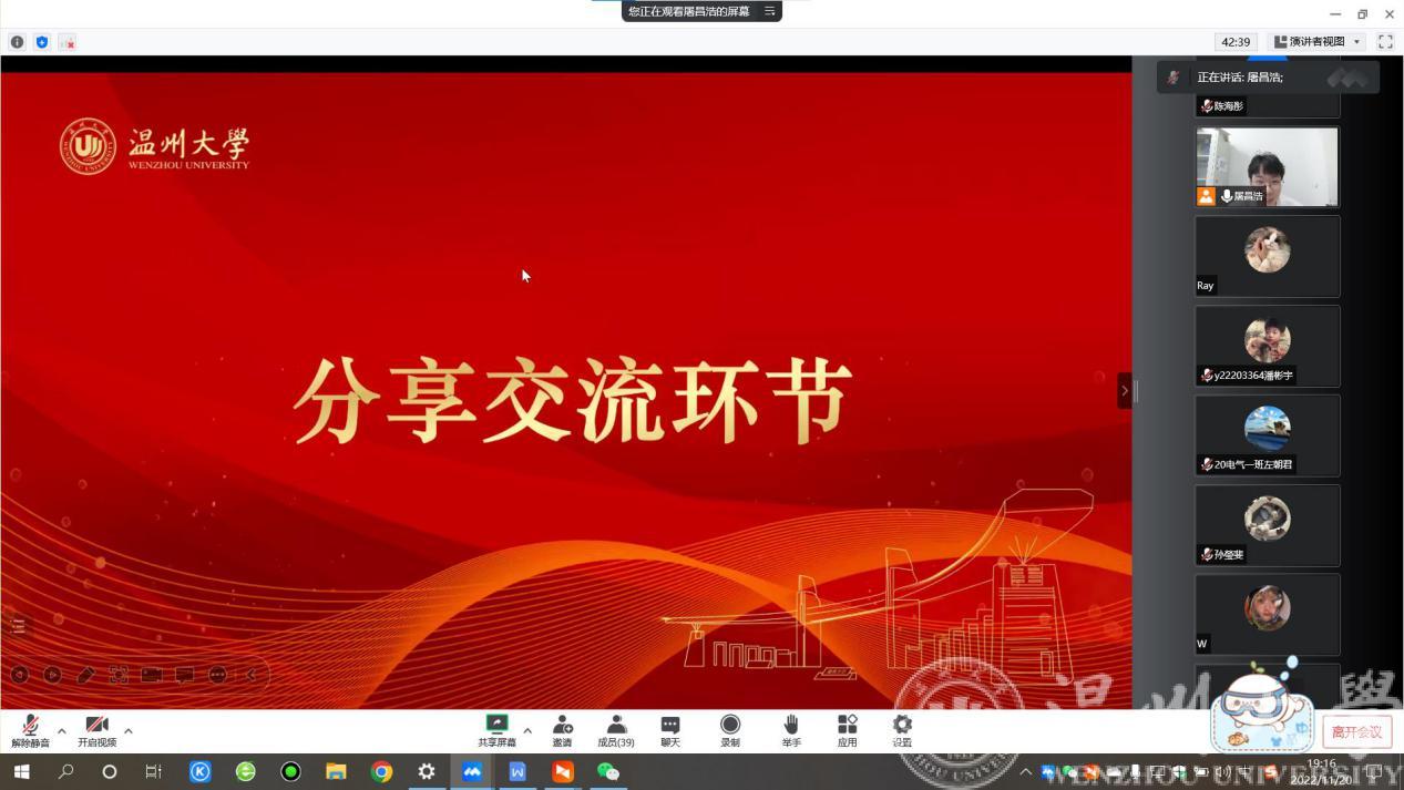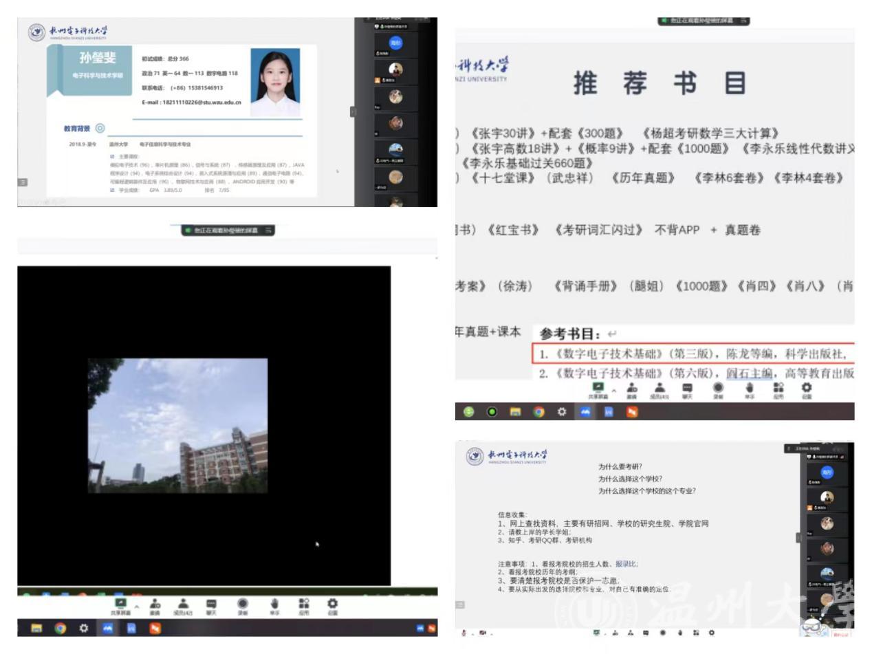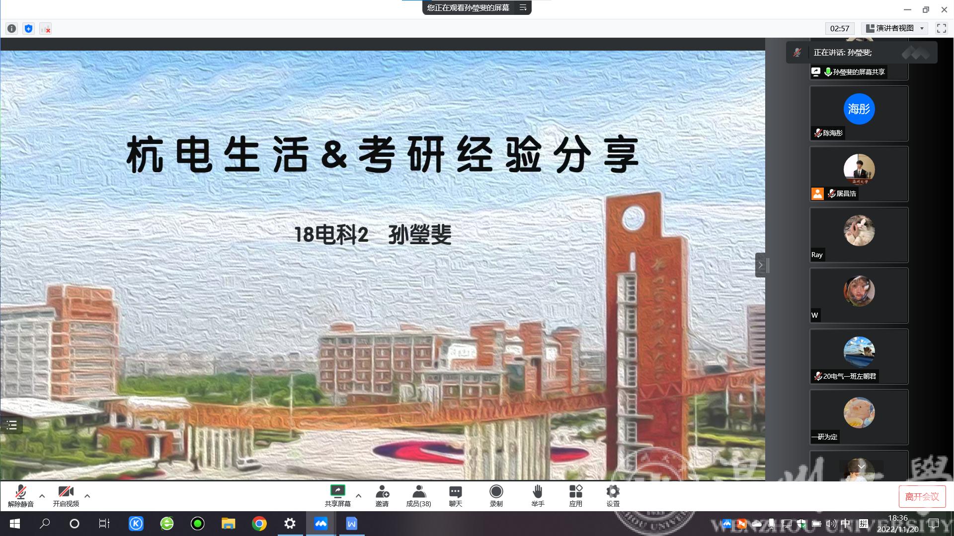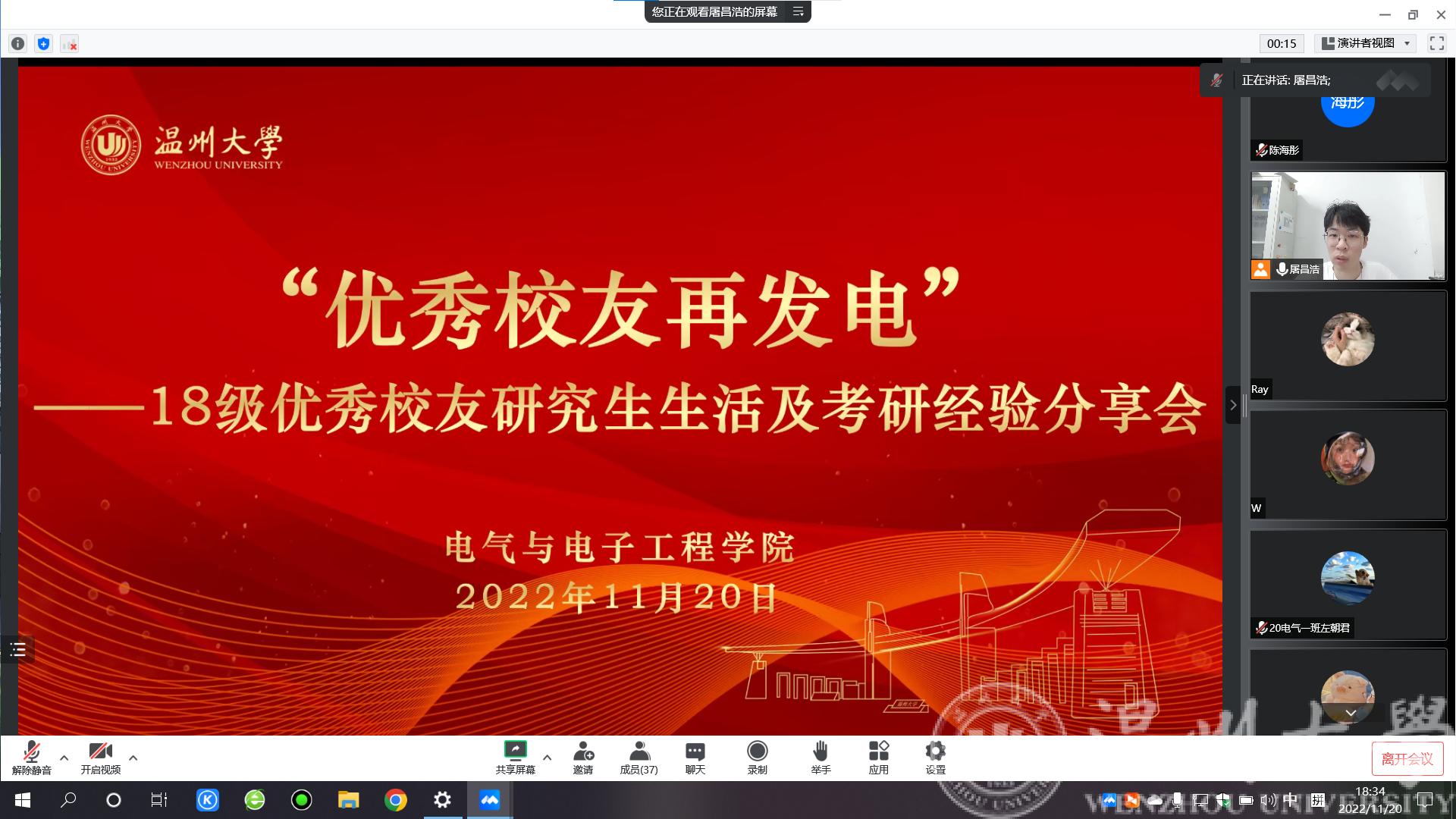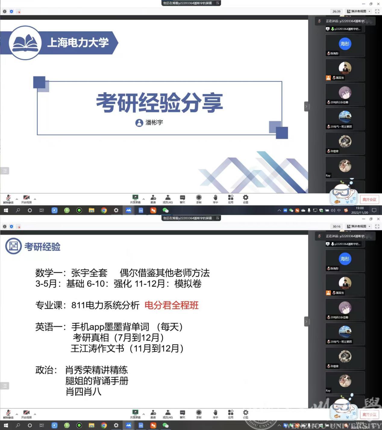 为进一步营造提高我院学生考研热情,营造良好考研氛围,同时增强校友与母校交流合作,发挥校友榜样力量。学院于11月20日晚召开组织召开线上18级优秀校友考研经验分享会。本次分享会邀请到2022届优秀毕业生孙瑩斐(目前就读于杭州电子科技大学,电子科学与技术专业)、潘彬宇(目前就读于上海电力大学,电气工程专业)为学弟学妹们们分享考研经验和研究生生活。出席本次会议的有院负责校友工作的辅导员屠昌浩老师、负责考研工作的辅导员陈海彤老师,即将参加2023年考研的学生及其他年级有意向考研同学。
