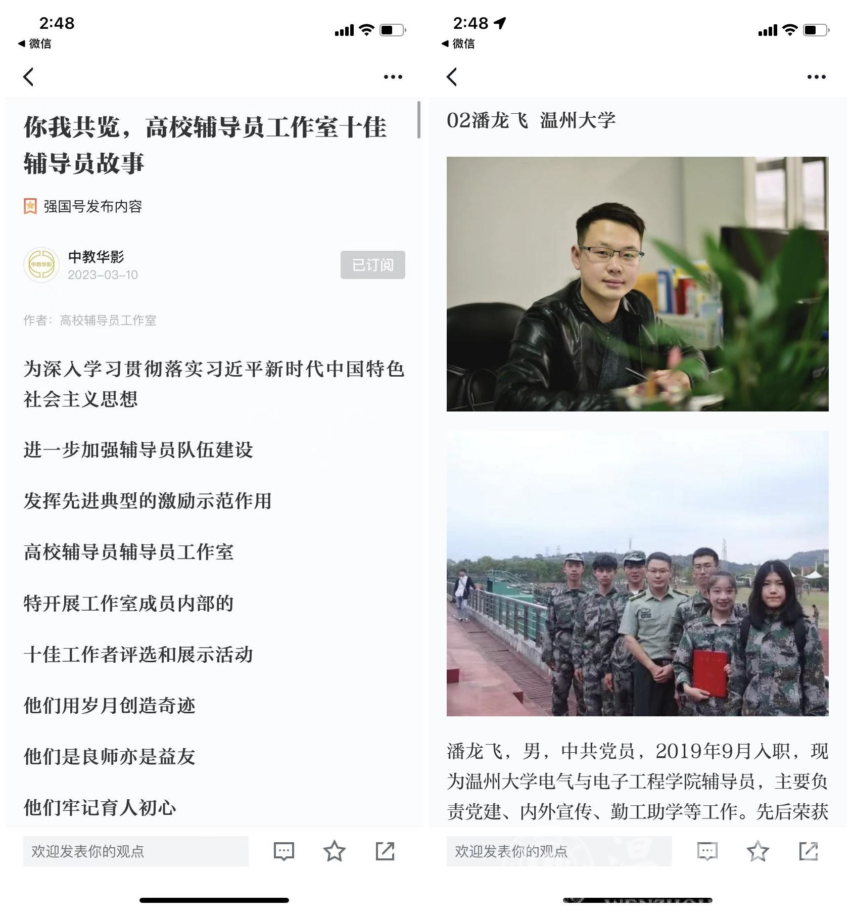 3月10日,学习强国刊发了一篇名为《你我共览,高校辅导员工作室十佳辅导员故事》的文章,该篇文章系全国高校辅导员工作室,为深入学习贯彻落实习近平新时代中国特色社会主义思想,进一步加强辅导员队伍建设,发挥先进典型的激励示范作用,进行的十佳工作者评选和展示活动,yl23455永利官网辅导员潘龙飞也在其中。