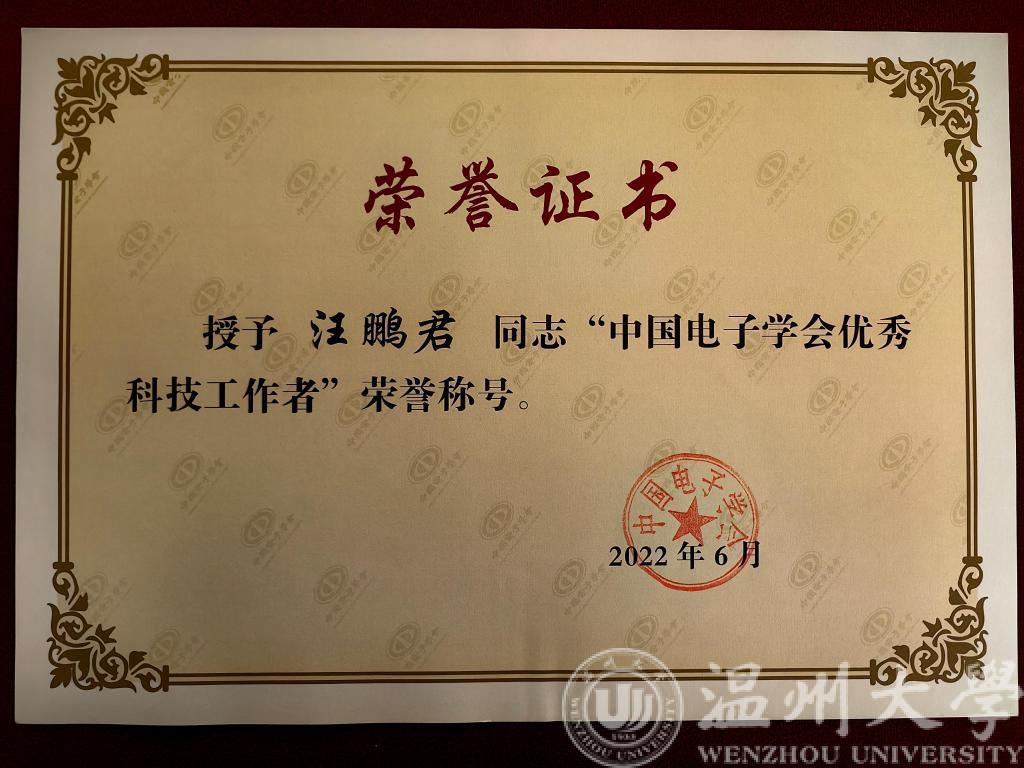 近日,第十六届中国电子信息年会在珠海国际会展中心召开,同步举行了中国电子学会科学技术奖励大会。温州大学汪鹏君教授因其在集成电路设计技术领域突出的科研成果与学术成就,经浙江省电子学会推荐,荣获“中国电子学会优秀科技工作者”称号。