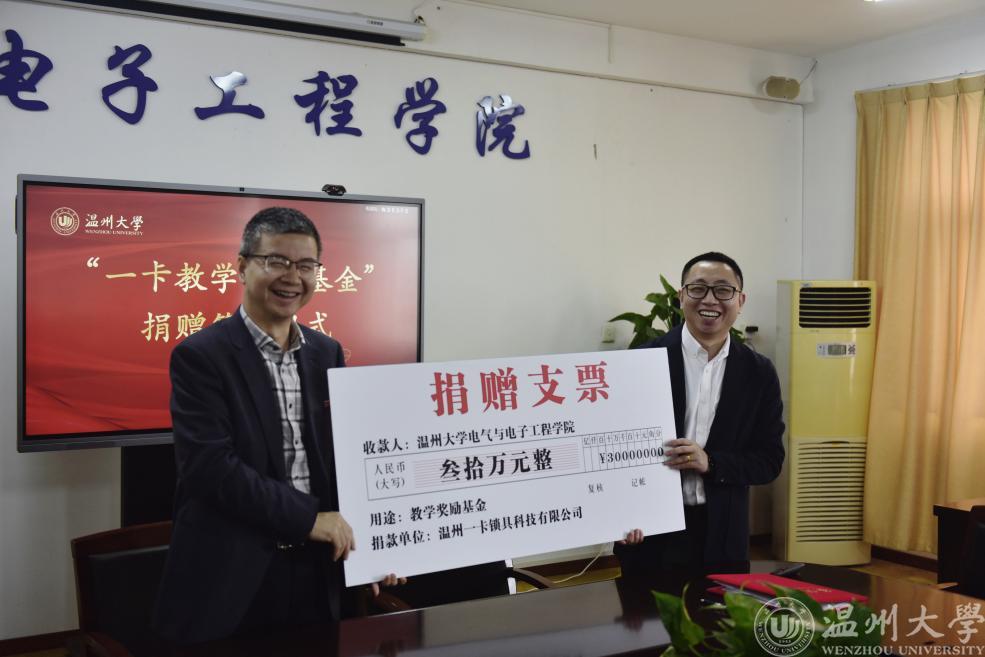 4月12日,温州大学与温州一卡锁具科技有限公司签订合作协议,同时企业向学校捐赠设立“一卡教学奖励基金”。根据协议,温州一卡锁具科技有限公司向学校无偿捐资30万元人民币,在该校yl23455永利官网设立“一卡教学奖励基金”。