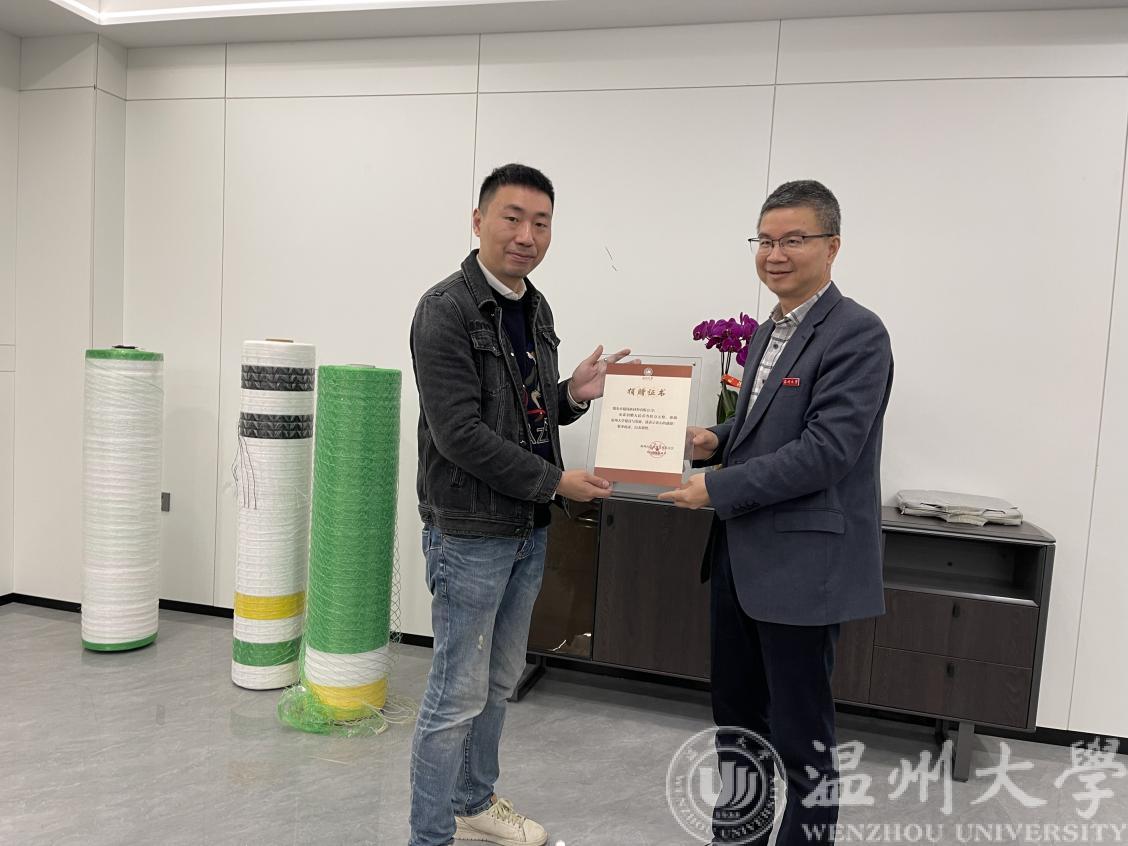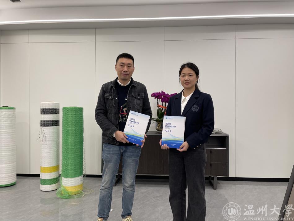 “学长,终于见到你了……”温州大学2023届省级优秀毕业生叶依秀再过两个月就毕业了,4月12日跟随学校领导一同来到瑞安超扬新材料有限公司见到了温州大学2001级校友岑帆。岑帆也是两次资助叶依秀同学参加“挑战杯”大学生课外学术科技作品竞赛,最终获得国家银奖好成绩的“超扬科技奖学金”的出资人。