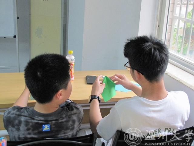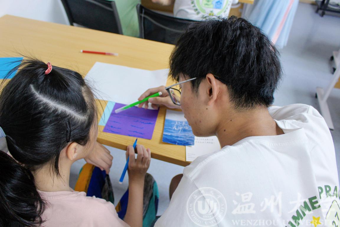 暑假期间,温州大学橄榄枝暑期实践队队长联系了相关孤独症组织,带领队员们来到温州地区心智障碍者家庭资源中心开展了为期三天的,以“让阳光透进紧闭的门,温暖每一个来自星星的孩子”为主题的志愿活动。每一天的课程都由一种主题课和自由活动组成,由队员一对一陪伴孩子完成。许多队员看到熟悉亲切的孩子,热情主动地与他们结伴沟通。第一天,实践队开设了花样的手势舞教学课程。精彩的手势舞搭配美妙的旋律开辟了饱含另一番风情的天地,成功吸引了孤独症儿童参与学习。在队员们的悉心指导下,不少孩子能够跟随音乐独立完成一支完整的手势舞,这全面调动了孩子们的视觉和听觉,锻炼和提高了孩子们身体的协调性。第二天,绘画与手工世界的大门向孩子们打开。各式各样的彩纸与五颜六色的画笔给孩子们的生活带来了五彩缤纷的乐趣。队员们手把手教孩子们学折纸,将心仪的折纸形象一步步呈现出来,细心地按压、整理。绘画是孤独症儿童表达情感最好的途径之一,也是孩子们最喜欢的日常活动,通过七彩画笔,他们心中的闪光世界被一点点描绘勾勒,白纸上跳跃着动人的天赋与才能。星星的孩子有些沟通能力薄弱,但队员们用坚定的毅力和极大的耐心进行交流,及时安抚孩子们的情绪。通过悉心陪伴,也让他们感觉到自己不是被孤立的,填补他们心中的空缺,同时让他们获得了满足感、成就感和自信心。最后一天,队员们精心准备了各色粘土和工具,给孩子们带来一堂轻松有趣的粘土课。轻粘土能够锻炼孩子的动手能力,促进小手肌肉的发展,增强孩子的手眼协调能力。在队员们的帮助下,不少孩子成功制作出别致有趣的作品并开心地带回家保存。在每日的主题课程之后,孩子们可以选择与队员进行自由活动,有飞镖比赛、叠纸杯游戏、开火车、跳舞、唱歌等等,活动异彩纷呈,回味无穷。