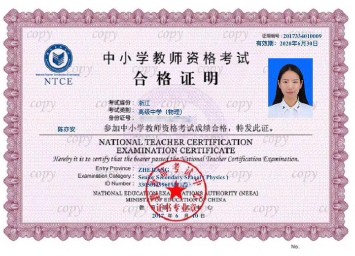 22岁的湖州女孩陈亦安,是温州大学数理与电子信息工程学院物理师范专业的应届毕业生。2017上半年至今,她先后考取了三个教师资格证:物理教师资格证、数学教师资格证和通用技术教师资格证。一人持有三个教师资格证,在温州大学师范类学生中极为少见,因此她的老师和同学笑说:“陈亦安同学考证跟玩儿似的。”