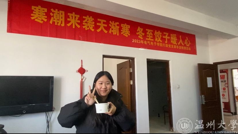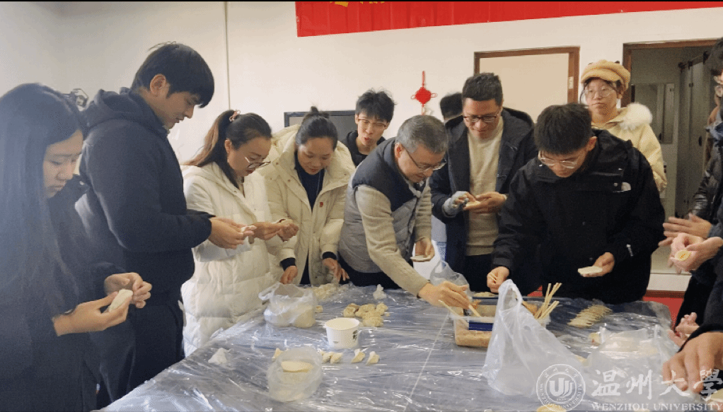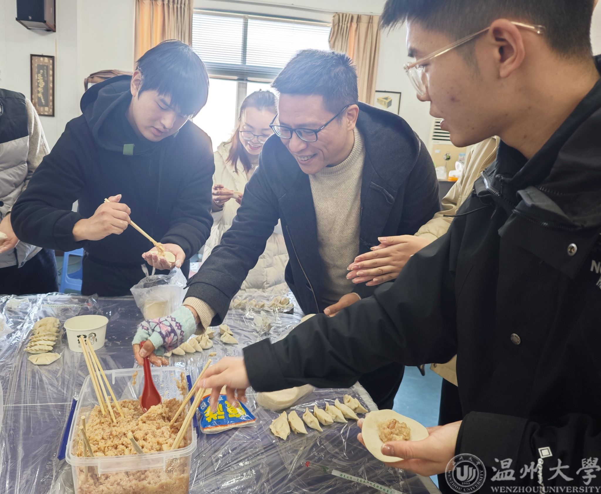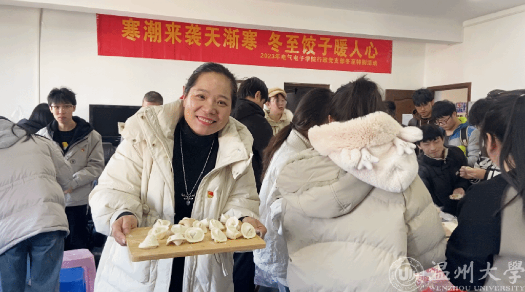 12月22日中午,温州大学电气电子学院行政教工党支部教师和结对帮扶学生齐聚一堂,话青春、包饺子,情暖冬至、其乐融融。