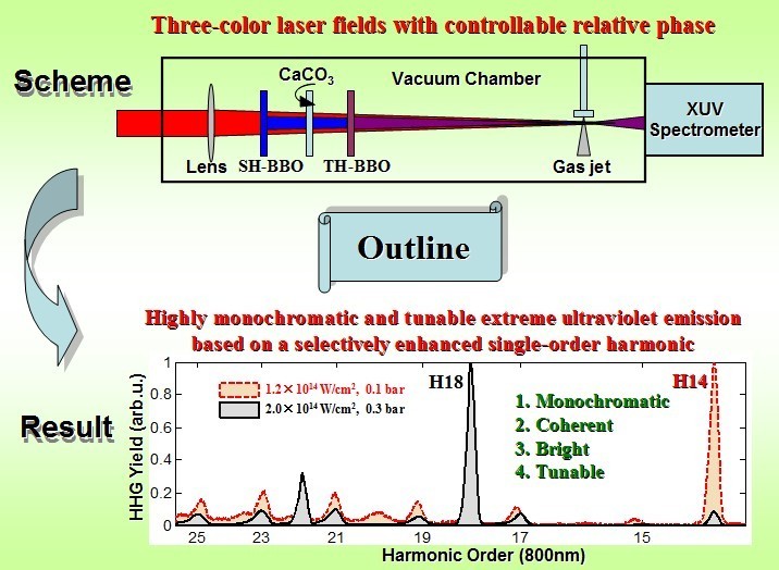 可调谐单色相干光源的产生方法一般是通过晶体的倍频或差频来产生,输出的波段多见于紫外-红外波段,在极紫外波段(100~10nm)很难使用上述方法产生。但极紫外光源在现代生产和科研中有着极其重要的应用。因此有必要采用新的方法和新的手段来产生这种极紫外波段的单色相干光源。最 近,我院尉鹏飞老师与中科院上海光机所的李儒新教授密切合作,利用飞秒激光与惰性气体相互作用产生高次谐波,然后通过宏观相位匹配和原子内相位匹配技术将 高次谐波频率梳中的能量集中调谐到某个特定阶次,使其只输出某个节次的特定高次谐波,这个特定高次谐波还能通过相位匹配技术进行调谐,获得的单色极紫外辐 射(XUV)在强度和对比度上表现均很优秀。这种方法在国际上首次被提出,实验结果优异,获得三个审稿人的一致肯定。该研究工作发表在最近出版的《物理评论快报》上(Phys. Rev. Lett. 110, 233903, 2013).