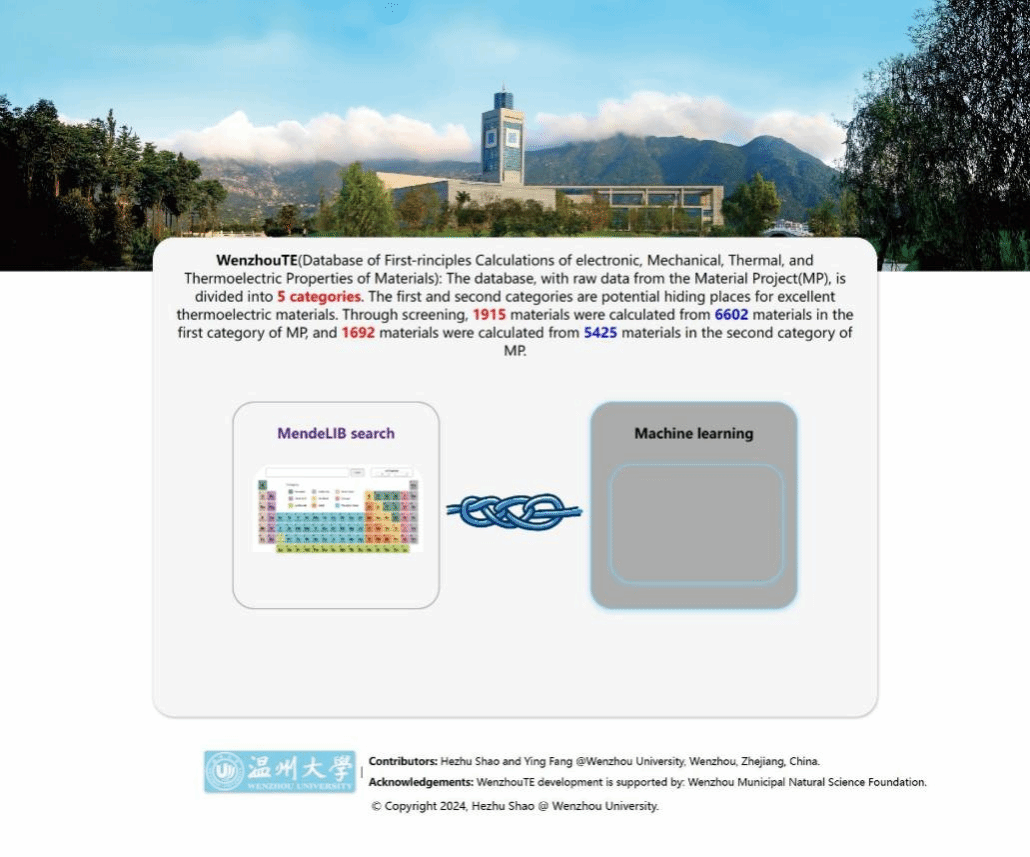 日前,民进温州市委会委员、yl23455永利官网副教授邵和助带领团队在经费与条件极其有限的情况下,构建了一个基于第一性原理计算的热电材料数据库,并为其搭建了搜索网页(https://hezhu2024.github.io),向学术界和工业界免费公开。