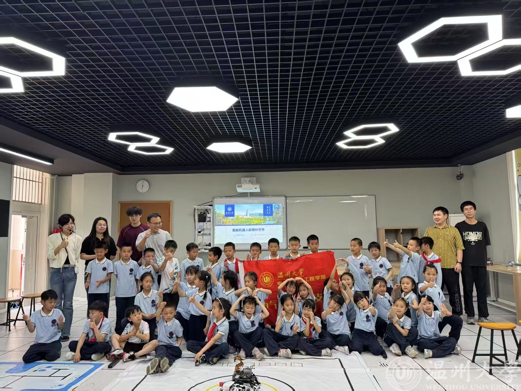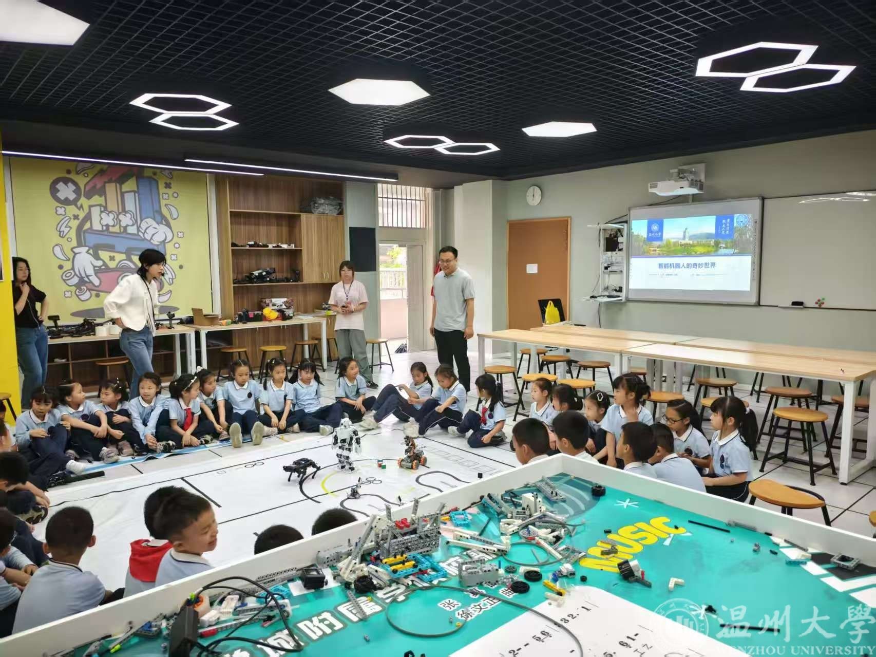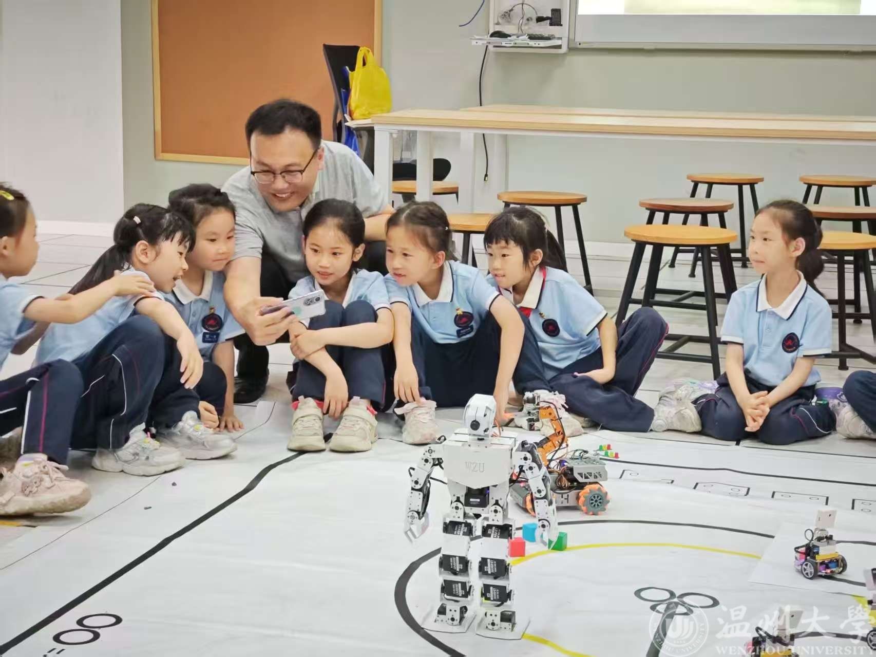 5月20日,yl23455永利官网电气系党支部党员发挥先锋引领作用,带领本科生党员走进温州大学城附属学校,开展《智能机器人的奇妙世界》科普教学活动。党员们通过实物展示、互动体验与趣味讲解,为孩子们开启科技创新的探索之旅,让科技梦想在青少年心中悄然萌芽。