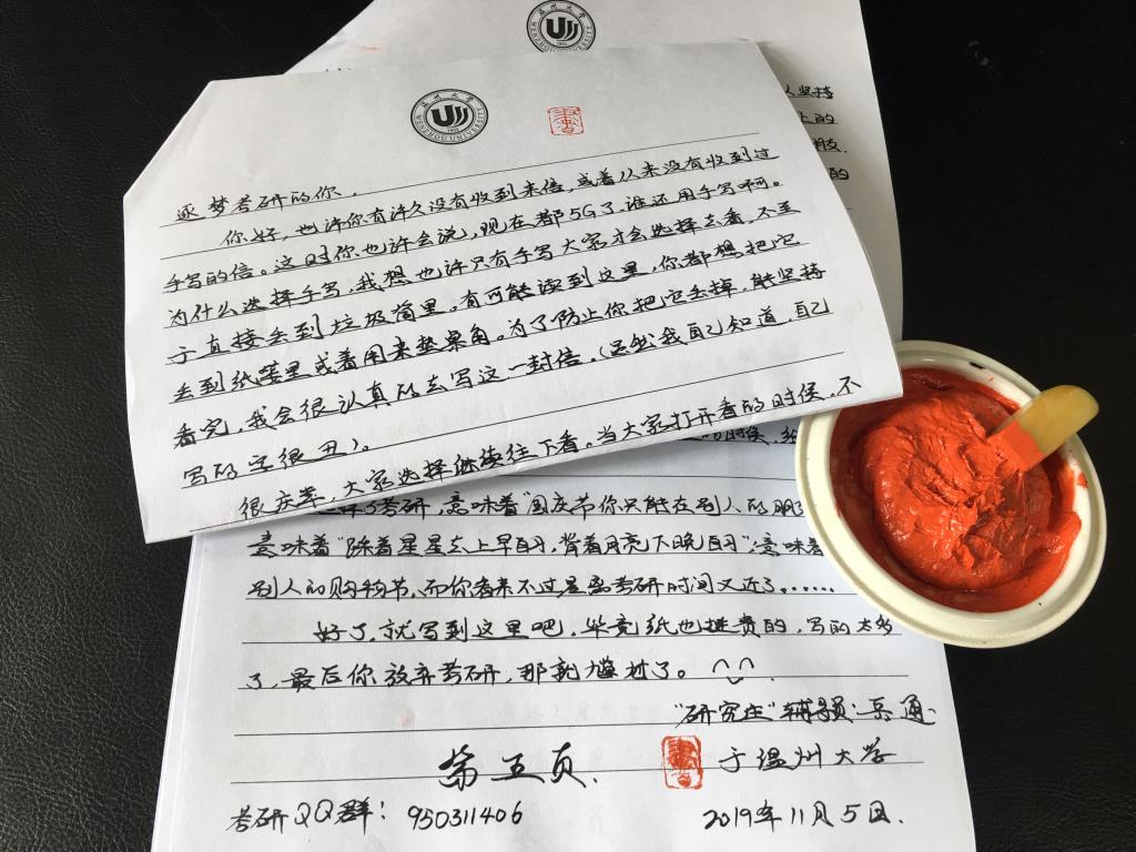 正在备考的大三学子张宸说:“拆开信封时,是惊喜,是好奇。这是一封解惑的信,通通老师用自身的真实经历,给我们讲述考研的过程,让我们更加亲切,不再惶恐;合上信封时,是感动和震撼,考研路途必然艰难,但我们一定会披荆斩棘,勇往直前。”