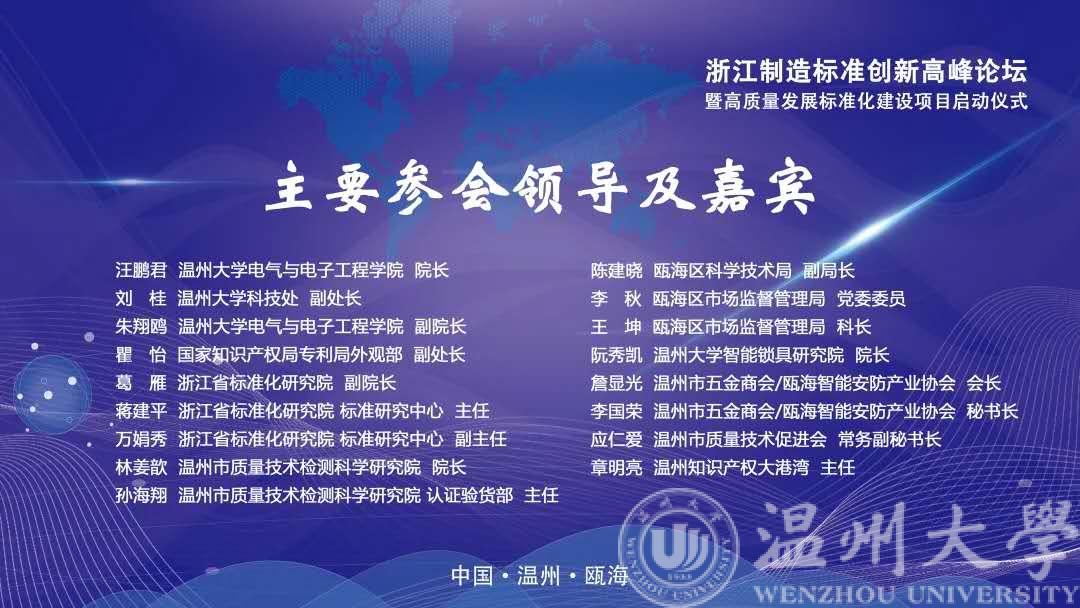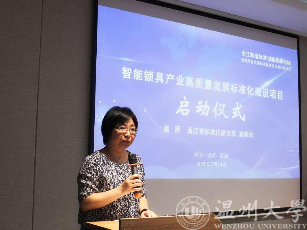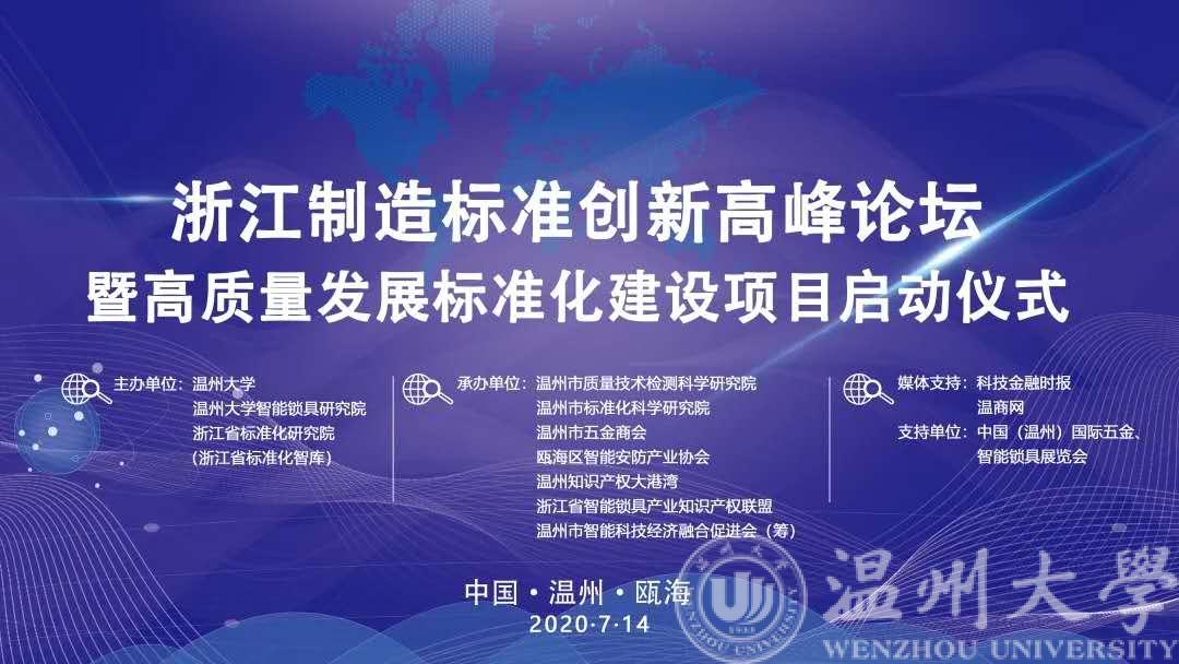 2020年7月14日下午,“浙江制造”标准创新高峰论坛暨高质量发展标准化建设项目启动仪式活动成功举办。本次论坛由温州大学、浙江省标准化研究院、温州大学智能锁具研究院主办,温州市质量技术检测科学研究院、温州市标准化科学研究院、温州市五金商会、瓯海区智能安防产业协会、浙江省智能锁具产业知识产权联盟、温州知识产权大港湾等联合承办。