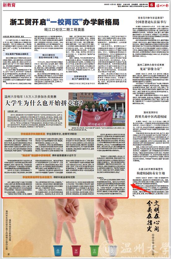 近日,温州日报发表了一篇署名为《大学生为什么也开始拼竞赛?》的文章,文章首先公布了在第六届中国国际“互联网+”大学生创新创业大赛上,我市温州医科大学、温州大学、温州职业技术学院三所高校分别取得的成绩,并分析了当前大学生为什么也都开始拼学科竞赛,我院朱海永教授接受了温州日报采访,就大学生热衷参加学科竞赛问题提出了自己的看法。