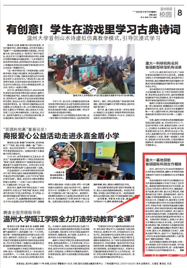 近日,省科技厅公布2020年度国际科技合作载体评审结果,温州大学申报的光电功能器件与数字化检测国际科技合作基地获批。