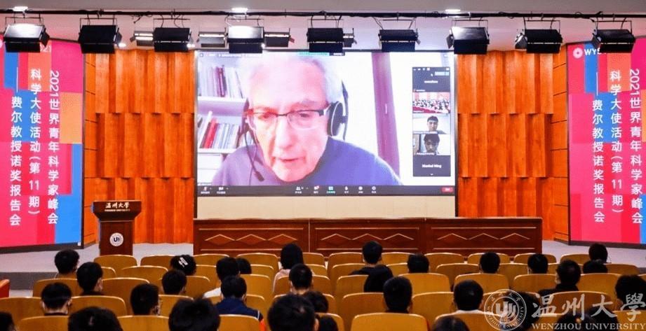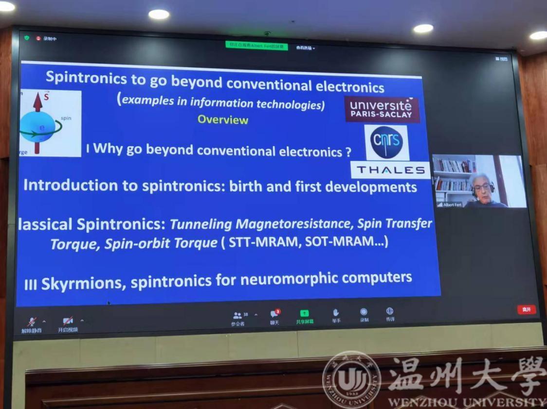 10月25日,2021年世界青年科学家峰会科学大使活动费尔教授诺奖报告会在温州大学岩松堂雁山厅举行。本次报告会,以温州大学为主会场,北京航空航天大学、浙江大学为分会场,采用现场会议+视频联线仪式,通过线上线下结合形式举行。yl23455永利官网负责主会场活动。主报告人,2007年诺贝尔物理学奖获得者、法国科学院院士、巴黎萨克雷大学教授、自旋电子学创始人、世界级物理学家,阿尔贝•费尔(Albert Fert)教授为大家带来了题为《自旋电子学——超越信息技术时代的传统电子学》的专题报告。