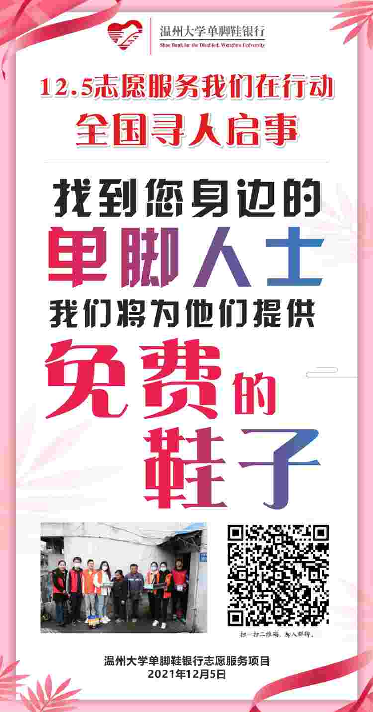yl23455永利官网单脚鞋银行志愿服务团队是一家致力于存储鞋子、存储爱的银行,他们凭借温州“鞋都”优势,立足于大学城,发挥青年学子的力量,为单脚残疾人士免费赠送单脚鞋。正值12月3日“国际助残日”和12月5日“国际志愿日”到来之际,为寻找和帮助更多需要帮扶的单脚残障人士,“单脚鞋银行”志愿服务项目团队于12月5日下午便在温州大学城商务中心开展了“聚焦残疾人士,传递公益爱心”寻找身边的单脚人士公益活动。