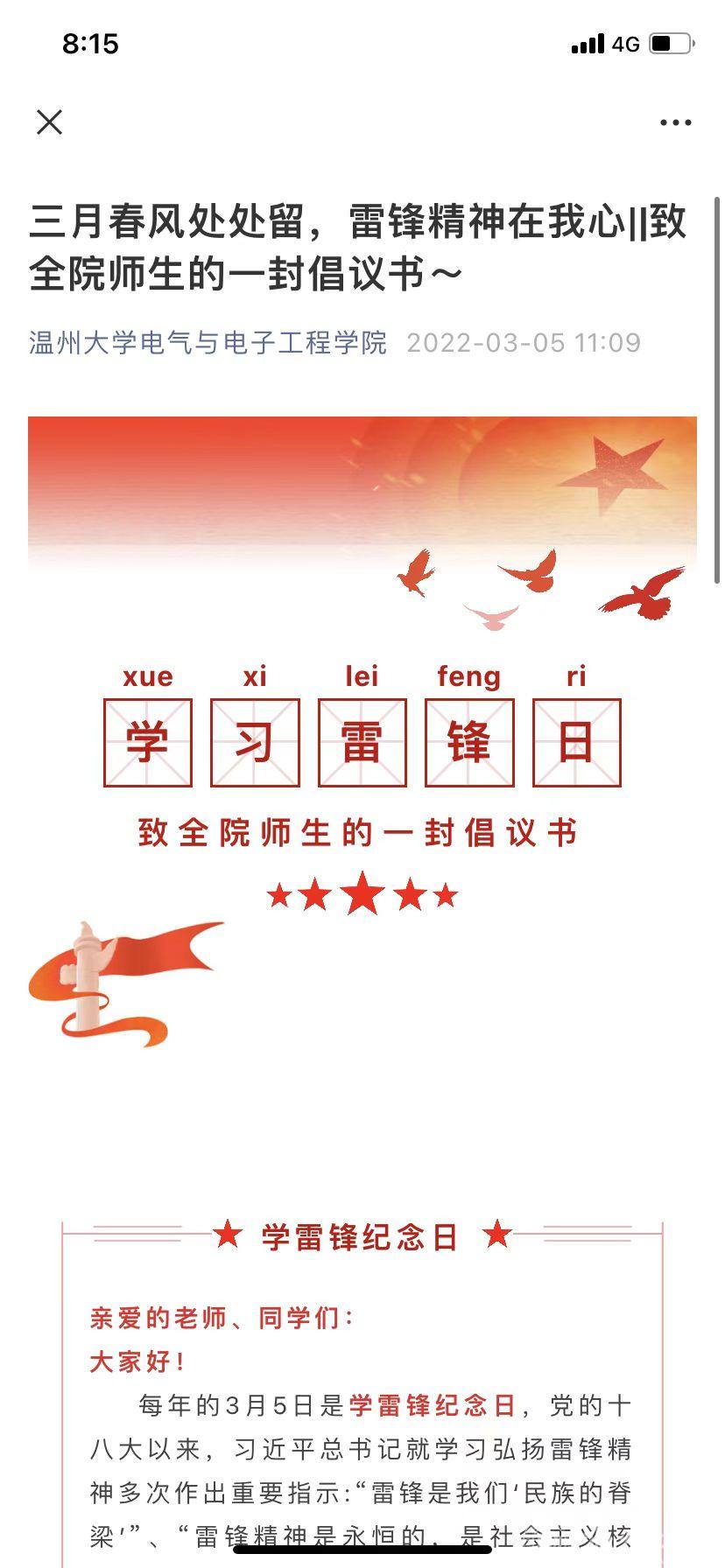 “三月春风处处留,雷锋精神在我心”,雷锋日到来的前几天,yl23455永利官网团委·学生会的学生干部就已经开始筹备今年的雷锋日特别活动了,其中《学习雷锋日——致全院师生的一封倡议书》的撰写和微刊制作,都是由学生参与完成。倡议书总共分为三个部分:在“勤劳廉洁,敢为人先”部分,倡议学生坚决抵制奢靡浪费的不良之风,树立正确的社会主义核心价值观,争做文明礼貌、廉洁勤劳的模范;在“志愿服务,温暖你我他”部分,引导学生了解“奉献、友爱、互助、进步”的志愿者精神,鼓励学生在学习知识之余,积极参与社会实践;在“助人者最乐,行善者最美”部分,提倡“勿以善小而不为”,引导学生从点滴做起,从小事着眼。倡议书的字里行间无不体现着对雷锋精神的赞美和对青年学子的美好寄托,“道阻且长,不行不止”,倘若有一份光,那就发一份热,燃烧自己,照亮他人,熄灭也无憾也。