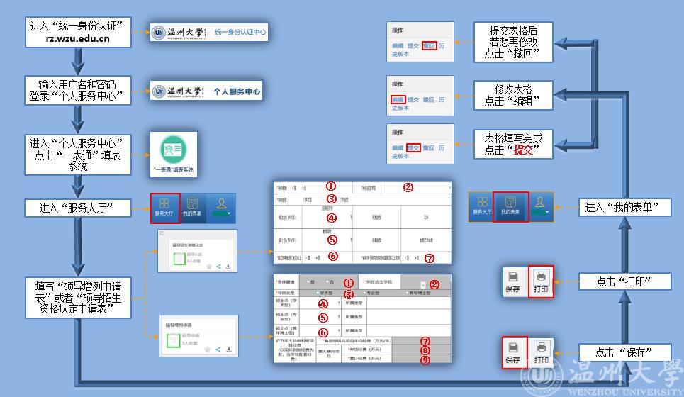 (1)校内人员申请,进入温州大学官网首页,点击“统一身份认证”,登录“个人服务中心”点击“一表通填表系统”,进入“服务大厅”页面,填写 “硕士生导师申请表”或“硕导招生资格认定表”,然后点击页面左上方“提交”按钮、再点击“打印”按钮,将打印出的纸质申请表提交学院。佐证材料无须提供。另外,申请表中涉及教学项目和教学成果奖励信息(附件4)由申请人另外自行填写,随申请表一起上交,附佐证材料。