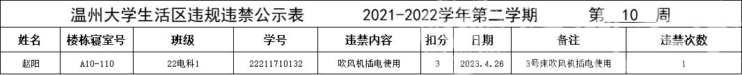 自2022-2023学年第二学期入学开始,学校针对宿舍安全每周进行大排查。根据学校第十周寝室安全卫生检查结果,排查到1位同学存在寝室违规现象,受到学校通报。现根据学校相关规定,对该名同学进行院内通报批评,请其他同学引以为戒(名单见下)。