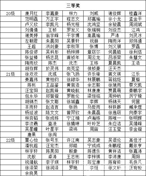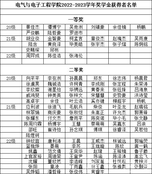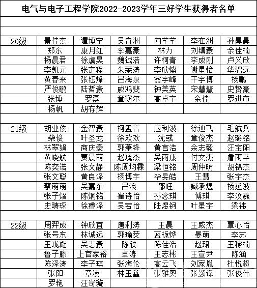根据《温州大学奖学金实施办法》、《温州大学学生综合素质考评实施办法》、《温州大学三好学生评选办法》进行2020级、2021级、2022级学生2022-2023学年奖学金以及三好学生评选。经学生申请确认、学院评选,共评选出景佳杰等297名同学获得综合奖学金,张淞等25人获得单项奖学金,景佳杰等136名同学获“三好学生”称号。现将名单予以公示,请班级以及个人认真核对。