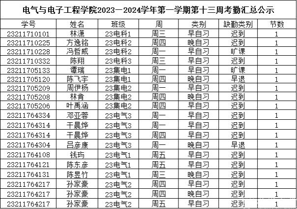 表1 2023.11.27-2023.12.3 十二周 学校学风检查情况