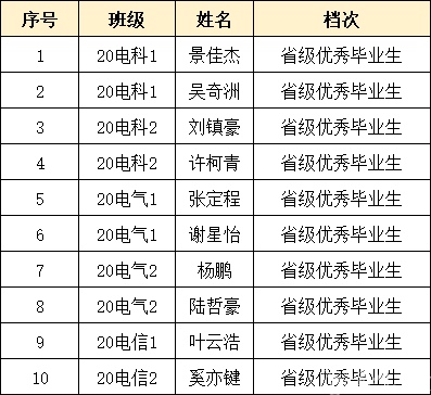 根据《温州大学优秀毕业生评选办法》(温大行政发[2020]104号),按照学校初次分配名额,根据前期进行2024届省级优秀毕业生的预评选,推荐 20电科1 景佳杰 等10名同学获得省级优秀毕业生荣誉称号,现将名单进行公示。