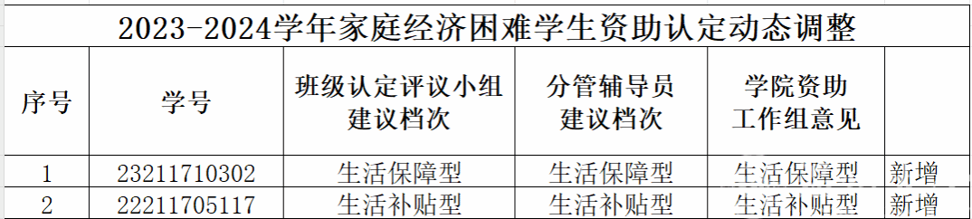 根据《温州大学家庭经济困难学生认定办法》(温大行政〔2020〕37号)文件精神,结合实际情况,经学生个人申请,学院初评,对2位同学进行资助认定或动态调整工作。现将名单予以公示,公示期五个工作日,如有异议请于公示期内与学工办(1A-521)联系,具体认定档次以学校公示为准,特此说明。
