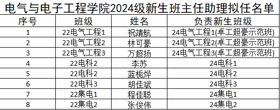 根据前期“关于招募2024级新生班主任助理的通知”,结合实际情况,经学生个人申请,学院评选,拟推荐下列8名同学担任2024级新生班主任助理,在此感谢同学们的积极申请!