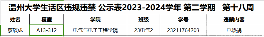 自2023-2024学年第二学期入学开始,学校针对宿舍安全进行大排查。根据学校第十八周寝室安全卫生检查结果,第十八周排查到2位同学存在寝室违规现象,受到学校通报;现根据学校相关规定,对上述同学进行院内通报批评,请其他同学引以为戒(名单见下)