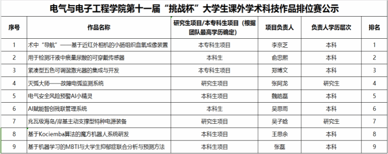 根据校发《关于组织开展温州大学第十一届“挑战杯”大学生课外学术科技作品竞赛和2025年度学生科研课题项目申报的通知》等相关文件要求,经团队申请、学院评比,现对我院本届“挑战杯”学生课外学术科技作品评审结果(排序)予以公示: