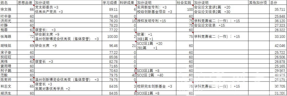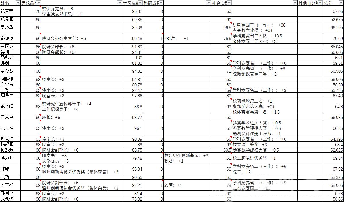 现将2020年研究生学业奖学金综合测评加分明细及总分公示如下,公示至10月11日,如有疑义,请在公示期内联系廖晓安老师(13567750214)。看不全图片的,请下载附件。