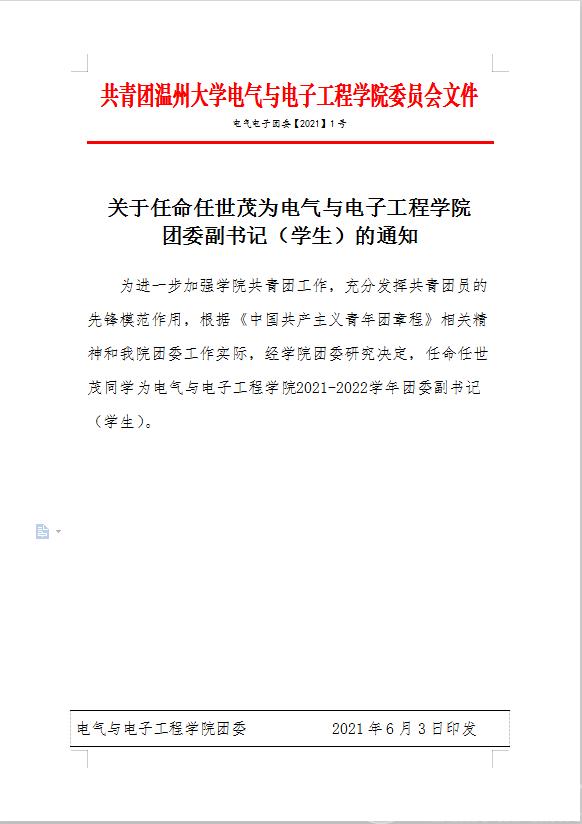 关于任命任世茂为yl23455永利官网团委副书记(学生)的通知