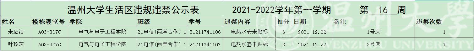自2021年下学期入学开始,学校针对宿舍安全每周进行大排查,根据学校第十六周寝室安全卫生检查结果,排查到我院朱应洁、叶玲芝两位同学存在寝室违规现象,受到学校通报。现根据学校相关规定,对以上同学进行院内通报批评,请其他同学引以为戒。
