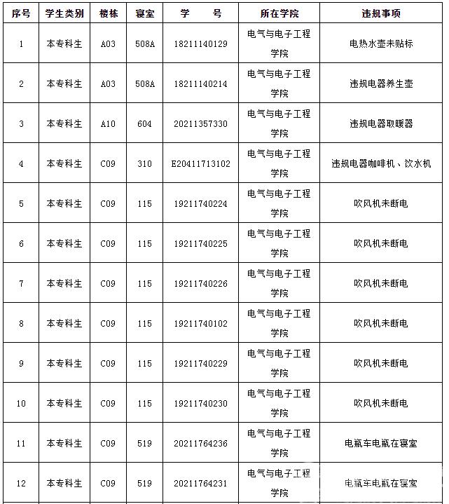 根据学校学生公寓安全“四级联查”工作机制要求,学工部、研工部、后勤管理处、保卫处联合于2月23日对学生公寓区安全情况进行检查,在检查中我院共存在12起安全违规现象,现予以通报批评,请大家引以为鉴。