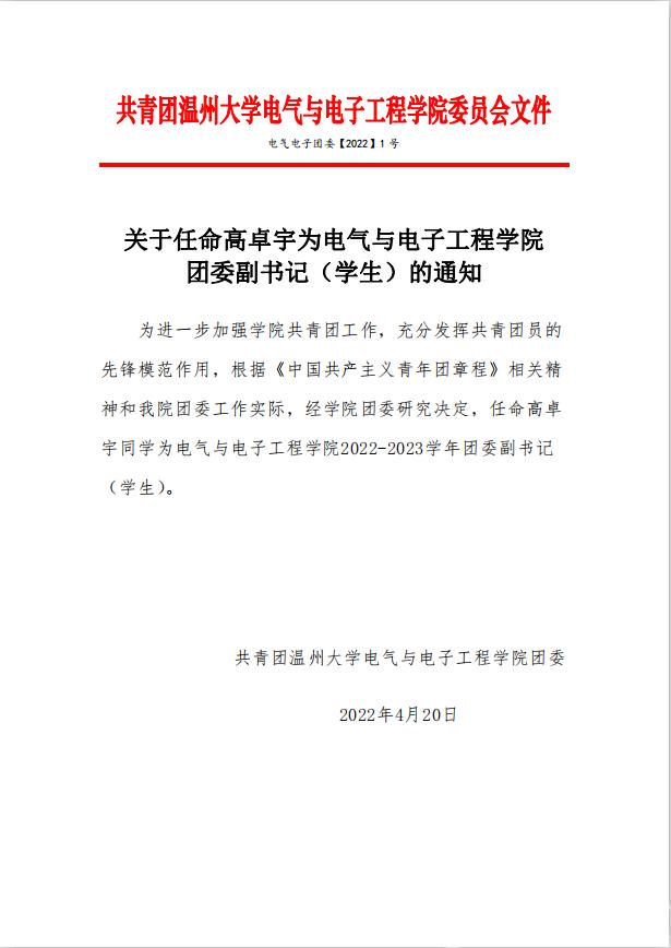 关于任命高卓宇为yl23455永利官网团委副书记(学生)的通知.pdf