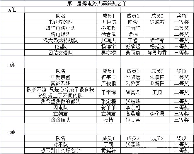 5月29日,我院第二届焊电路大赛圆满落幕。经过学院专业老师的评审,比赛结果已经确定,现公布如下: