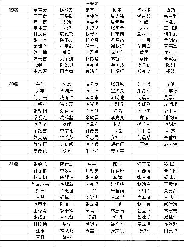 根据《温州大学奖学金实施办法》、《温州大学学生综合素质考评实施办法》、《温州大学三好学生评选办法》进行2019级、2020级、2021级学生2021-2022学年奖学金以及三好学生评选。经学生申请确认、学院评选,共评选出陈茹桢等317名同学获得综合奖学金,曹婧等4人获得单项奖学金,袁璐健等149名同学获“三好学生”称号。现将名单予以公示,请班级以及个人认真核对。