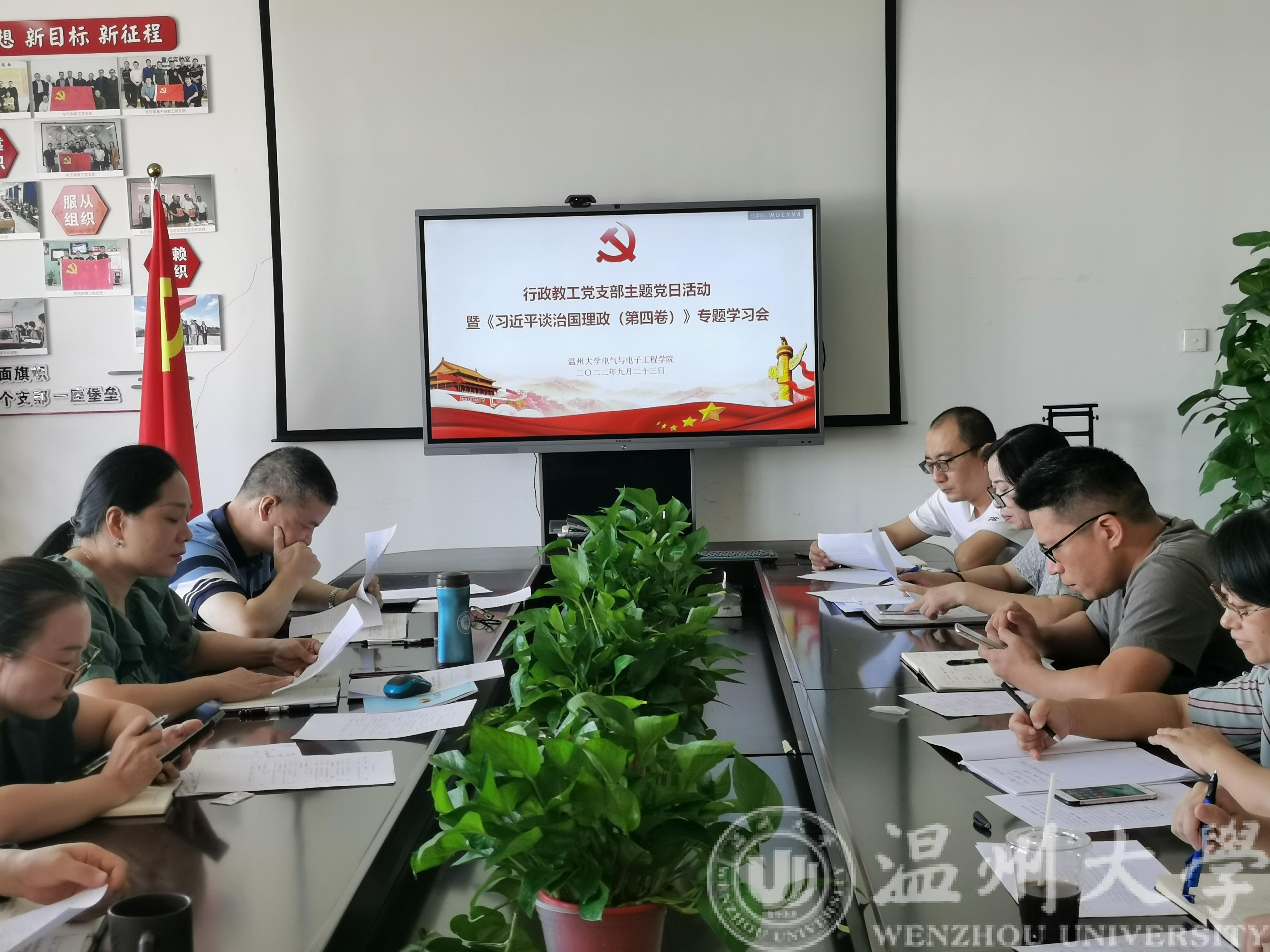 9月23日上午,yl23455永利官网行政教工党支部在院党务活动室召开主题党日活动暨《习近平谈治国理政》第四卷专题学习会,行政教工党支部全体党员参加了此次会议。会议由行政教工党支部书记曾蓓蕾主持。