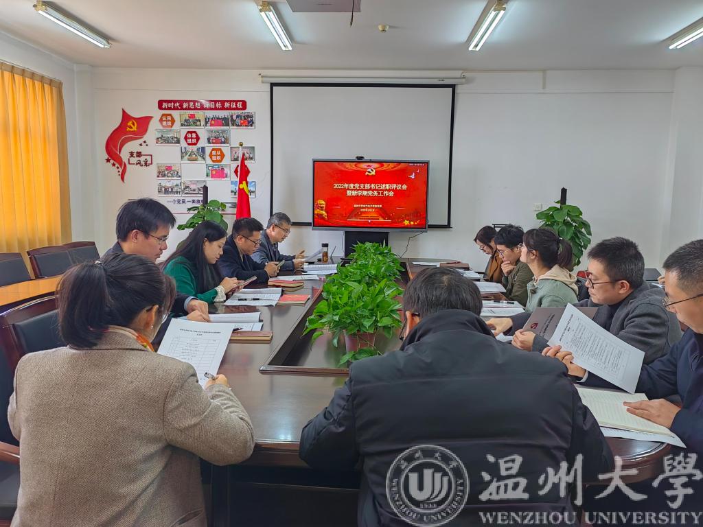 为深入贯彻落实党的二十大精神,扎实推进党建工作责任制,不断加强和改进基层党组织建设,3月2日下午,我院党委组织开展了2022年度党支部述职评议会议暨新学期党务工作会议,学院党委班子成员、专职组织员、11位师生党支部书记参加会议。会议由学院党委书记李方强主持。