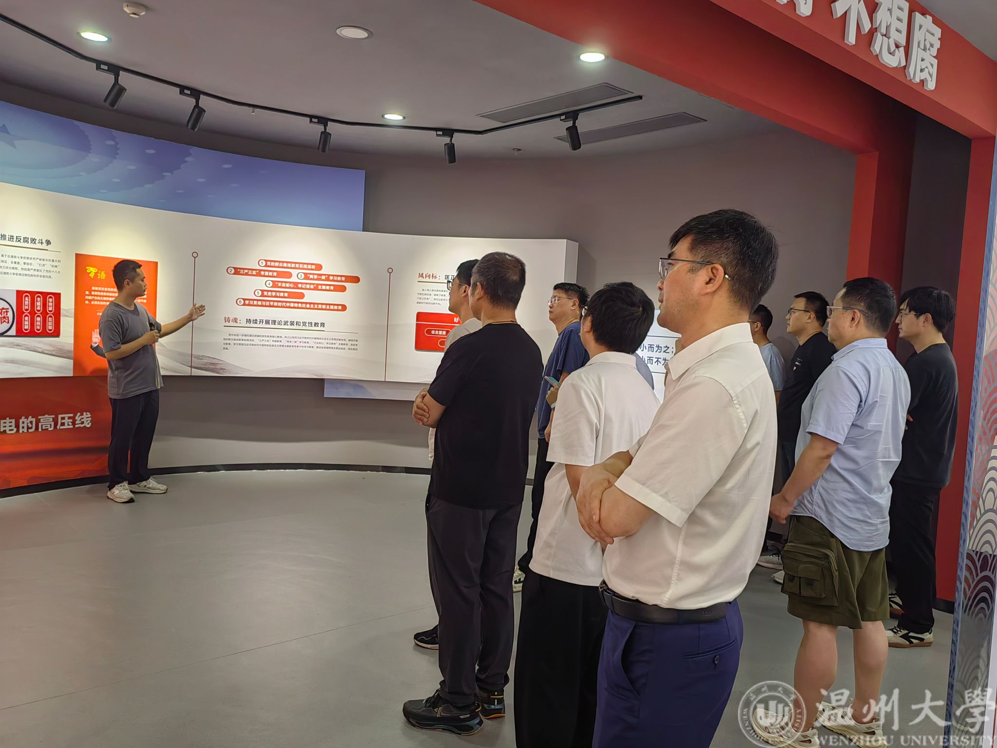 东瓯清廉馆是温州市纪委监委机关联合市委党校建设的高标准、多功能的清廉展馆。展馆以“廉风润东瓯 山水育清辉”为主题,下设清正、亲清、青廉、清规、清微、清辉及清雅等7个专题展厅。在讲解员的引导下,教师党员们依次参观专题展厅。展厅内通过丰富的展版展品和多媒体技术,生动展示党的二十大精神、新时代全面从严治党伟大历程、“清廉温州”建设的亮点成效以及温州本土廉洁文化底蕴等内容,并以警示教育片、忏悔录等形式对近年来温州查处的领导干部职务犯罪大案要案和党员干部违纪违法典型案例进行警示剖析。