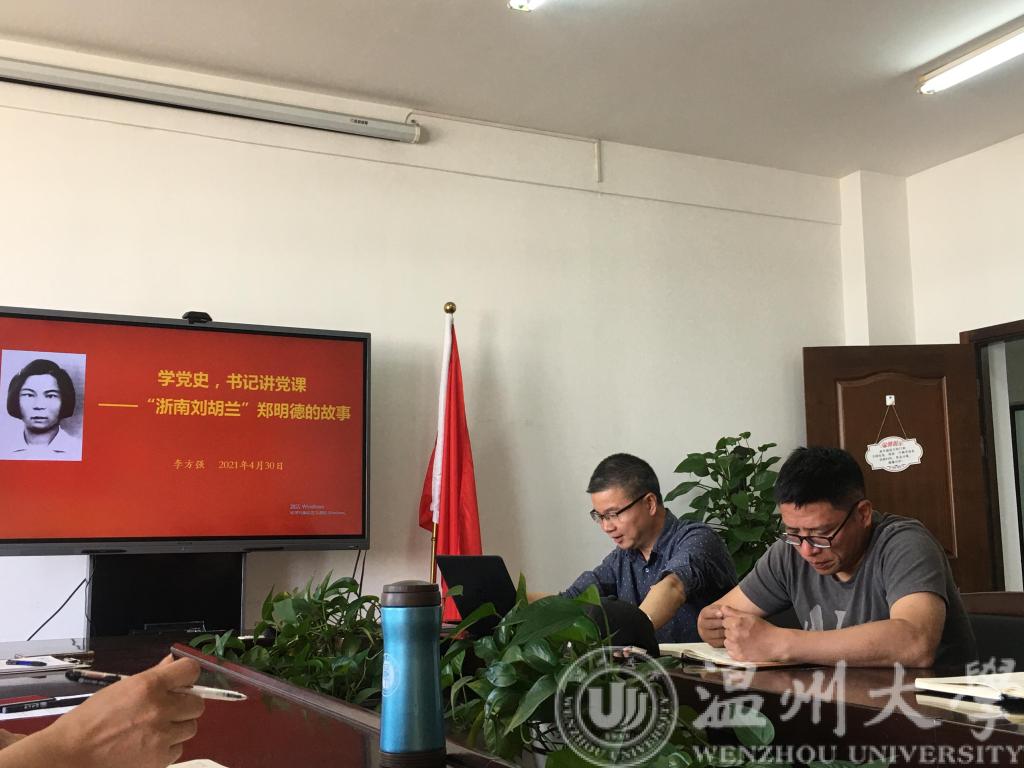 活动第一项议程由行政党支部书记曾蓓蕾围绕近期支部活动开展和党史学习情况进行了总结。曾书记指出,本学期我支部“学业帮扶工程”继续加强,希望支部成员及时与对接学生联系,做好学生的学业帮扶和指导,并对接下来党员办实事活动做了具体安排。活动第二项议程党史学习交流汇报。支部党员结合《习近平在浙江》理论学习材料和近期党史学习感悟依次进行交流和分享。活动第三项书记讲党课。由我院党委书记李方强为全体党员讲授党课。李书记党课题目是《“浙南刘胡兰”郑明德的故事》。李书记结合史实,讲述了年仅16岁的革命烈士郑明德被国民党抓捕,英勇不屈,最后不幸被国民党杀害的英勇事迹。“她带着对党的无比忠贞划上了生命的句号,她用殷红的鲜血写下了壮丽动人的史篇,她的故事一直在浙南地区传诵,人们称颂她是‘浙南刘胡兰’”。