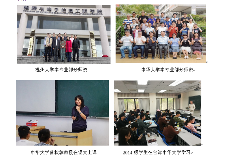 温州大学物理与电子信息工程学院本专业教师团队,拥有专任教师41人,其中:教授11名,副教授10名,讲师20名,其中:拥有博士学位28人,温州大学教学名师2名。教师以30-50岁的中青年骨干教师为主,教师来自美国、英国、日本、浙江大学、厦门大学、中科院等国内外知名学府。