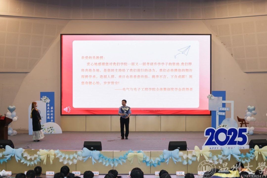 吴桂初老师为荣获2025年聚创升学奖的同学们颁奖,并向学院再次捐赠24万元,用于继续鼓励支持我院学生升学深造。从2020年开始,吴老师已累计向学院捐赠54万元300余名历届学生受到资助奖励。